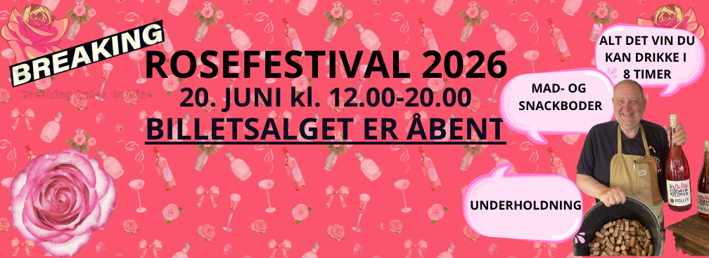 22 JUNI 2024 - ROSÉ FESTIVAL MED AL DEN VIN I KAN DRIKKE FOR 20 KR. + BODER FRA LOKALE GÅRDBUTIKKER - LEVENDE MUSIK - 11-00-17.00 - TILMELDING ER IKKE NØDVENDIG